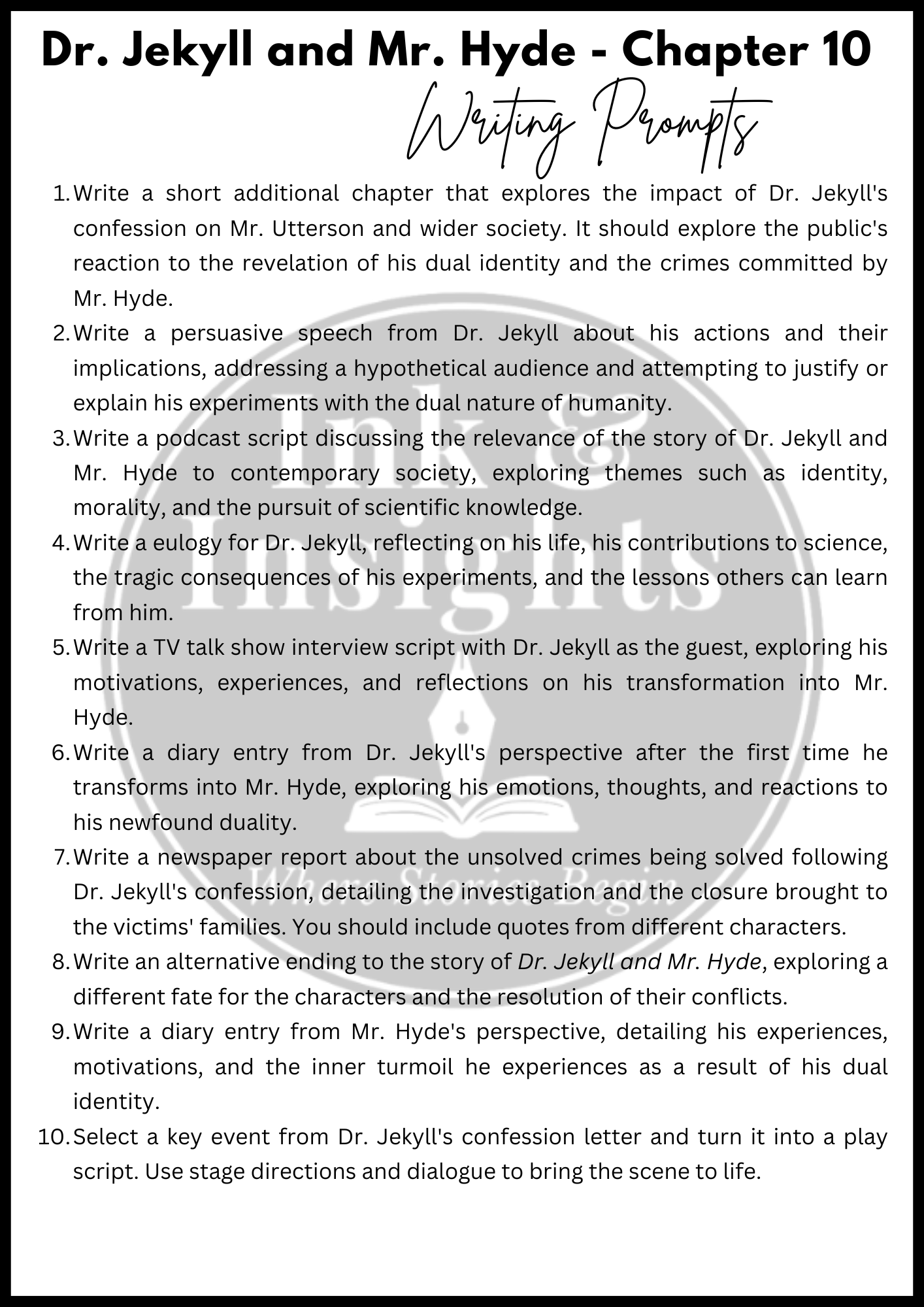 Each prompt is designed to deepen understanding of the text while encouraging imaginative thinking, literary analysis, and narrative skill-building. From eerie fog-covered streets to the psychological divide between good and evil, these tasks bring Stevenson’s gothic masterpiece to life in new and unexpected ways.