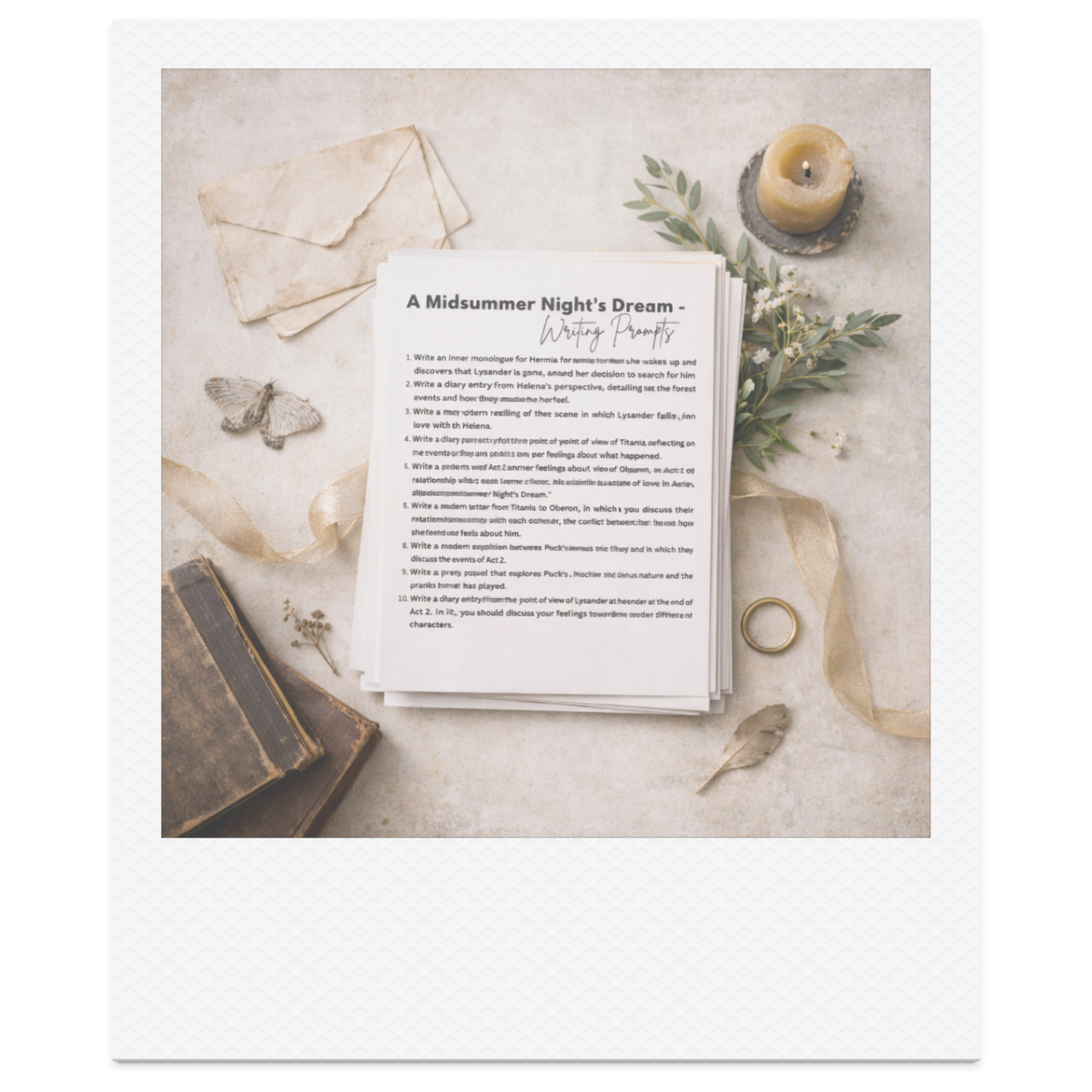 These prompts are designed to help students explore the events, characters, and structure of A Midsummer Night’s Dream through original creative writing. Rather than retelling the play, they encourage writers to think about perspective, misunderstanding, imagination, and the role of magic within the story.